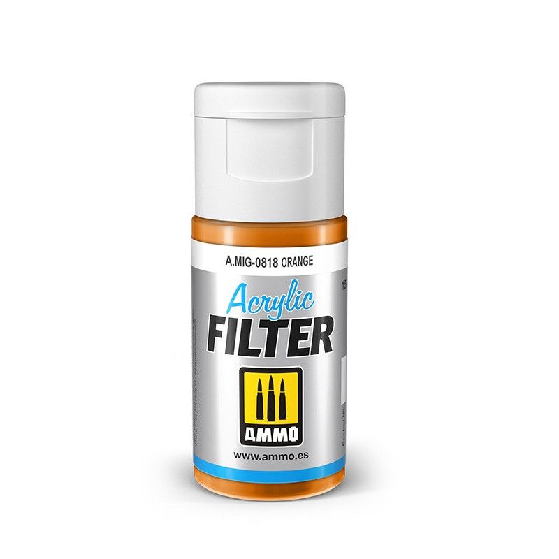 Acrylic filters are designed to be applied directly to the model. This range allows you to add colour variation to your miniatures, harmonize various camouflage colours, or distinguish areas with a different tone. The acrylic filter can be easily applied with a brush, which avoids the need for complicated masking. Moisten the brush with the product and apply it without flooding the surface. Thanks to the innovative formulation, the Acrylic Filters can be retouched or eliminated simply and easily with water during the extended dry time, each filter will dry completely in 24 hours. These versatile filters can also be applied by airbrush for an endless number of effects. Thanks to the wide range of 30 colours available, you won´t need to make complex mixtures, adjust for the proper thinning ratio, or adjust the tone to the intended shade. Each colour can be mixed with one another, or tinted with other AMMO acrylics. The acrylic filters can be diluted and cleaned with water, Acrylic Thinner A.MIG-2000 or Cleaner A.MIG-2001.