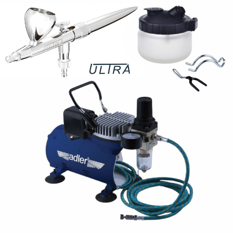 Med dette sæt har du alt det nødvendige du skal bruge for at komme i gang med at male med airbrush.