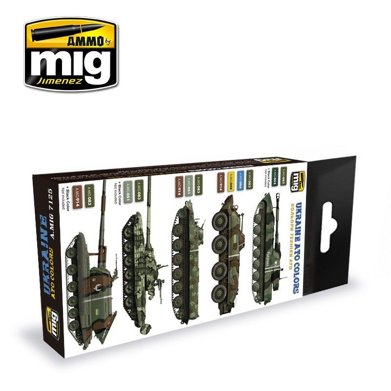 The war in eastern Ukraine or "Anti Terrorist Operation ATO" of 2014 and 2015 has become one of the most popular worldwide modeling issues. The large amount of photos and information about the vehicles that are participating here has made many modelers choose this topic. The many color systems of all vehicles used there are indeed complex and multitudes of standardized colors are mixed with others improvised on the battlefield. This set brings together a small selection of the most common colors used on combat vehicles, excluding the many colors used only on maneuvers or in pre-war times. Although many Ukrainians use official colors of Russian origin which can be found in our set A.MIG 7109 MODERN RUSSIAN SET COLORS, the colors featured here are specific colors of Ukraine. The yellow and blue colors are widely used for identifying vehicles in the national colors. The A.MIG A.MIG 083 and 914 are the base colors of most vehicles, very often seen combined with black, which is not included in this set. The color A.MIG 052 - similar to NATO green- is used in combination with brown A.MIG 914 by many units as the Ukrainian National Guard color. The color A.MIG 051 is another very special and specific green for digital camouflage applied to many vehicles, but also in combination with other colors in more conventional camouflage. These colors are developed in collaboration with Ukrainians and Ukrainian army military experts. All 6 jars are acrylic and are formulated for maximum performance both with brush or airbrush and the Scale Effect Reduction will allow us to apply the correct color on our models. Water soluble, odorless and non-toxic. Shake well before each use. Each jar includes a stainless steel agitator to facilitate mixture. We recommend MIG -2000 Acrylic Thinner for a correct thinning. Dries completely in 24 hours.