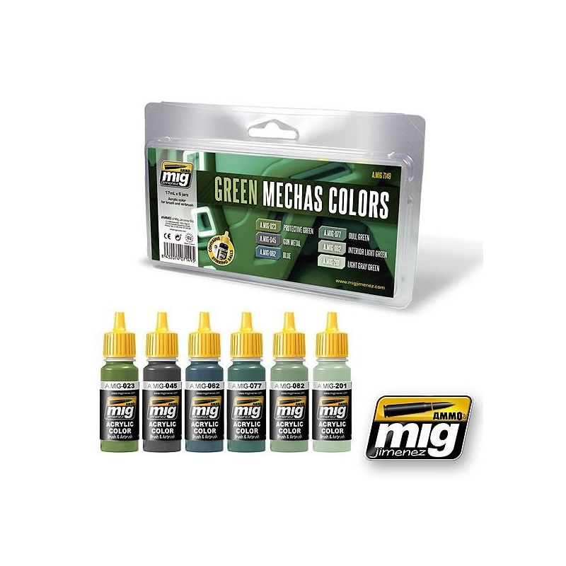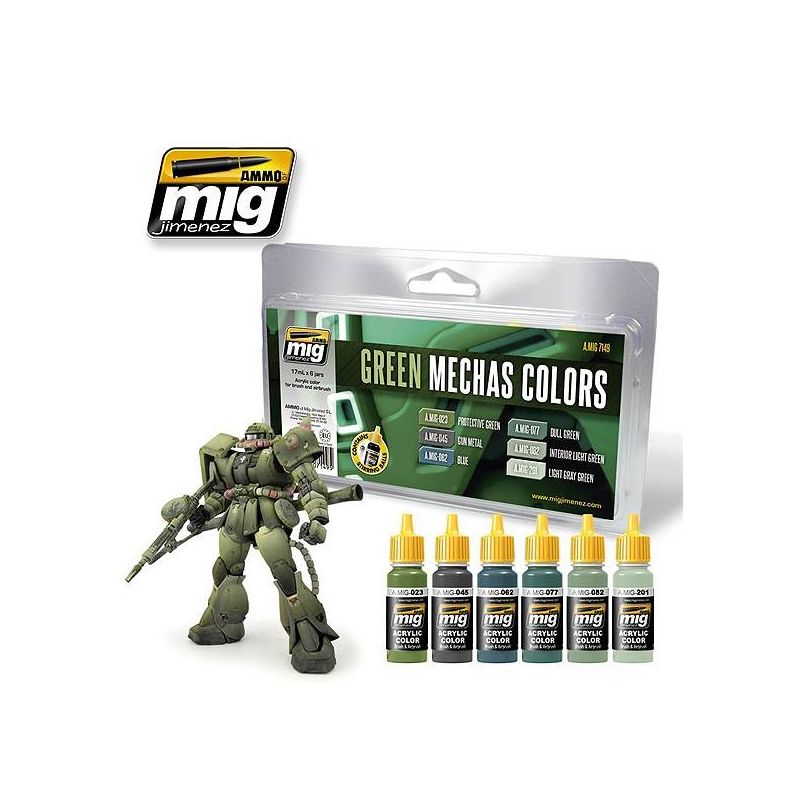 A set specially designed for Mechas and other sci-fi subjects. This set contains six colors for some of the most popular Mechas, for example Zakus. Exclusive set includes 4 different shades of green, perfect to add interest and different color tones to each plate, a blue and an acrylic gun metal. Accurate colors formulated with this modeling genre in mind. Water soluble, odorless and non-toxic. Shake well before each use. Each jar includes a stainless steel agitator to facilitate mixture. We recommend MIG -2000 Acrylic Thinner for a correct thinning. Dries completely in 24 hours.