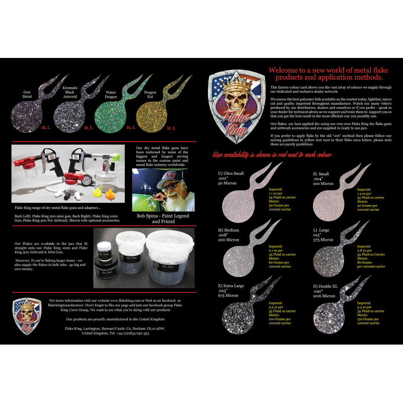 Flake King Polyester Flake was specifically designed to meet the requirements of manufacturers of decorated fabrics, adhesives, vinyl, sheeting, plastic molding, inks, paints, in industries such as automotive, leisure, commercial properties, theme parks, marine and many more, all of which require metal flake glitter with outstanding physical and chemical properties.