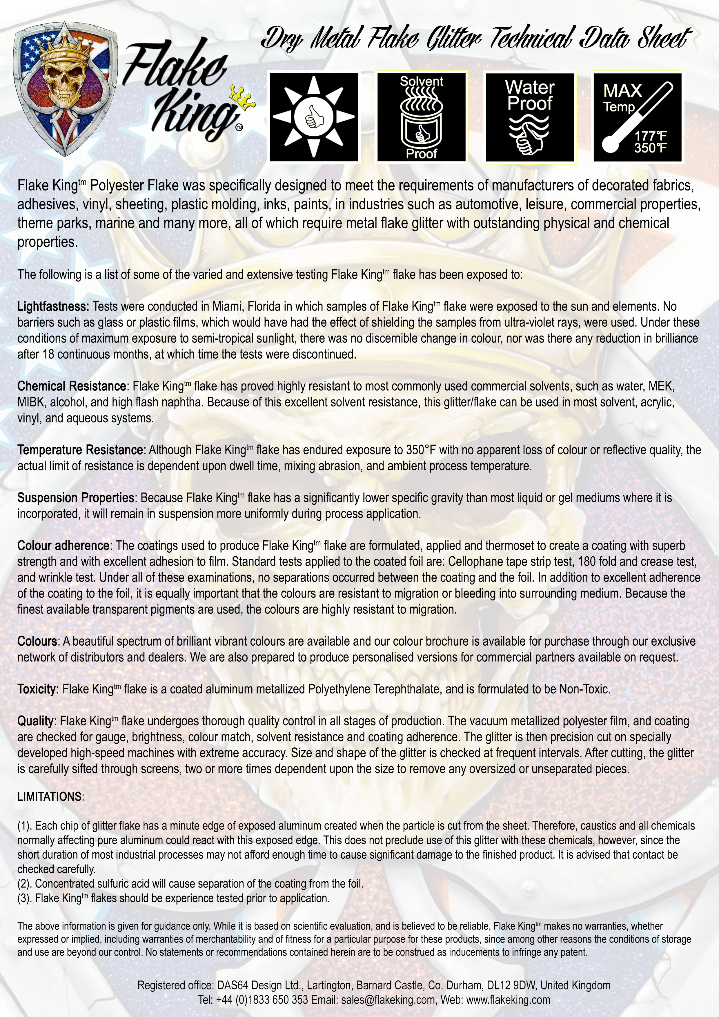 Flake King Polyester Flake was specifically designed to meet the requirements of manufacturers of decorated fabrics, adhesives, vinyl, sheeting, plastic molding, inks, paints, in industries such as automotive, leisure, commercial properties, theme parks, marine and many more, all of which require metal flake glitter with outstanding physical and chemical properties.