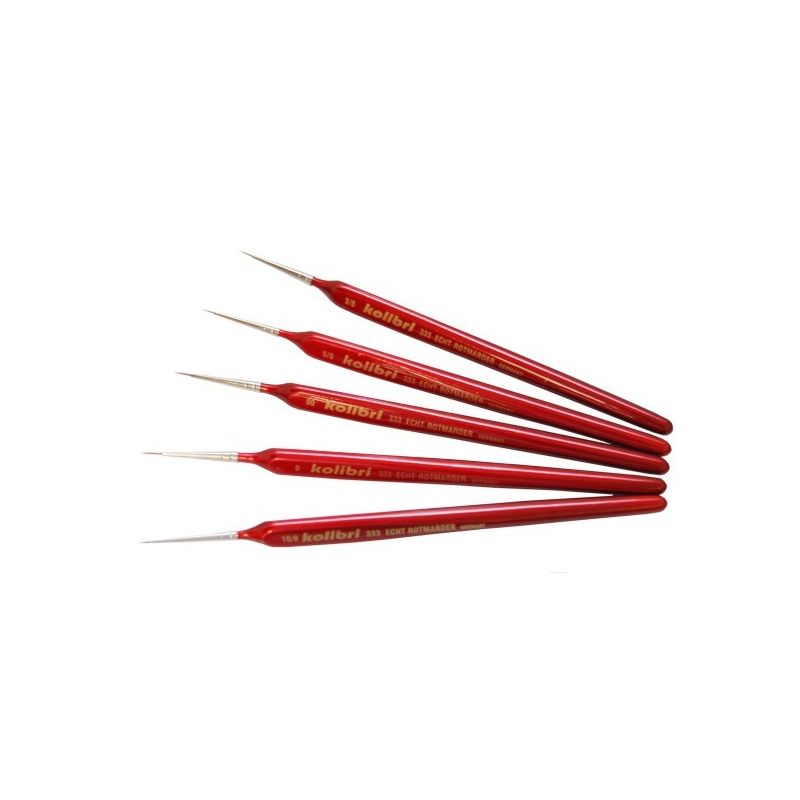 5 red sable brushes (size 10-0 to 0) for detail work, nickel plated ferrules, red polished triangular handles. The paint brushes can be held in the hand very comfortably and will not roll off the desk.