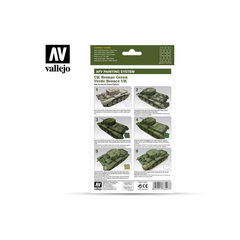 UK Bronze Green: This AFV Painting System, consists in the application of a series of base colors in half and quarter tones, in a gradual change from one shade to another. These effects of light and shadow, contrast and volume, will give the scale model an authentic and realistic appearance. See also our Weathering Set for Yellow and Grey vehicles (Ref.78.405).
